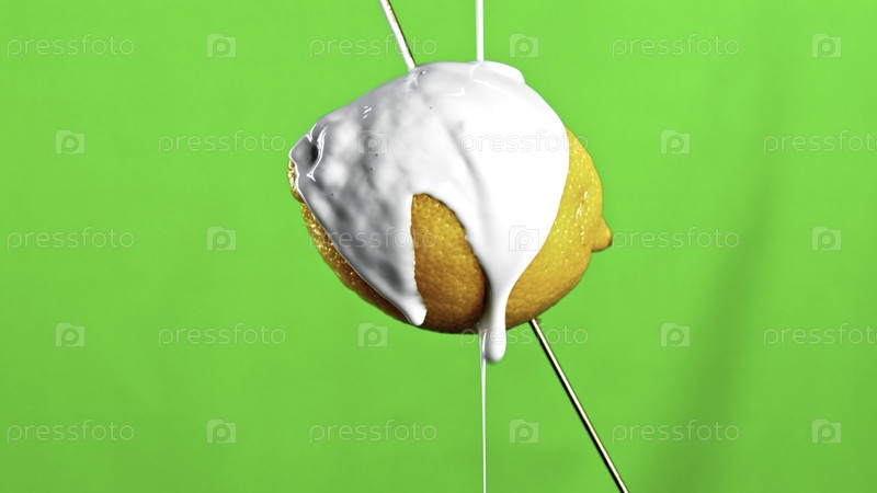 Свежий желтый лимон, изолированный на зеленом фоне. Застежка для акций. Налив белой краски на плод лимона с капельками, падающими вниз
