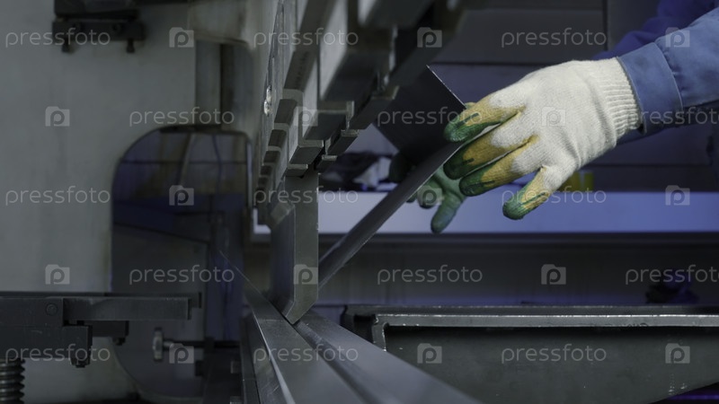 Ключевое изображение рабочего, прессующего металл в мастерской.Креативное.Листовая металлическая гидравлическая CNC-пресс тормозная машина