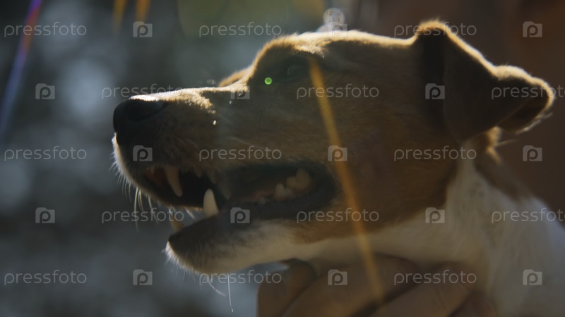 Близкий план красивой собаки в объятиях в солнечный день. Скриншоты. Человек держит и поглаживает прекрасную собаку на фоне красочного солнечного света. Мужчина держат Джека Рассела-терьера в руках в солнечный летний день