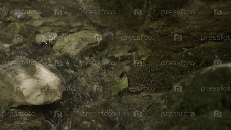 Дикая горная река, проходящая сквозь камни в замедленном режиме.Креативность.Быстрый чистый поток в национальном парке