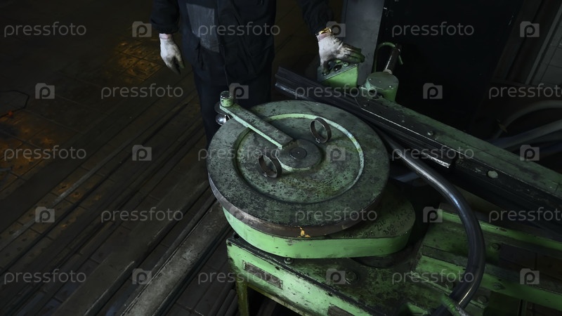 Пресс для изгиба листа на фабрике.Креативность.Рабочие сгибают металлическую трубу на старой производственной машине.Машина для изгиба стальных дисков для металлопроводов на заводе