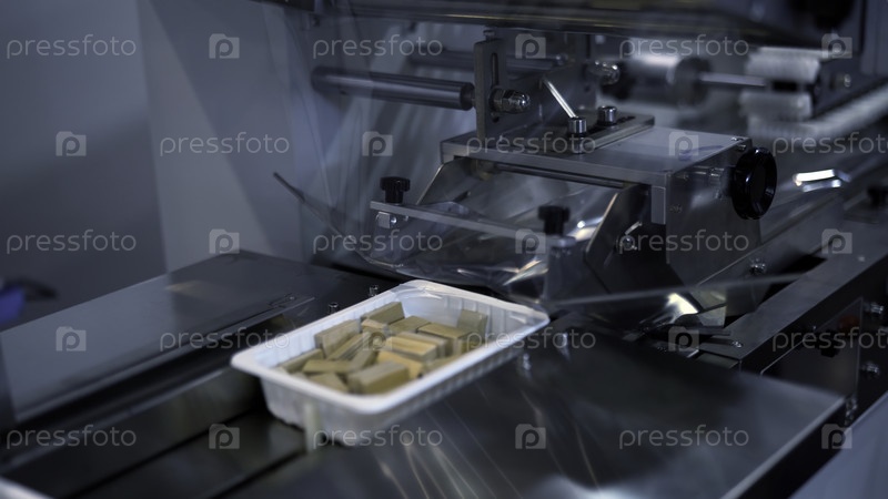 Пластиковая упаковочная машина на производственной линии. СМИ. Упаковка вафли на фабрике