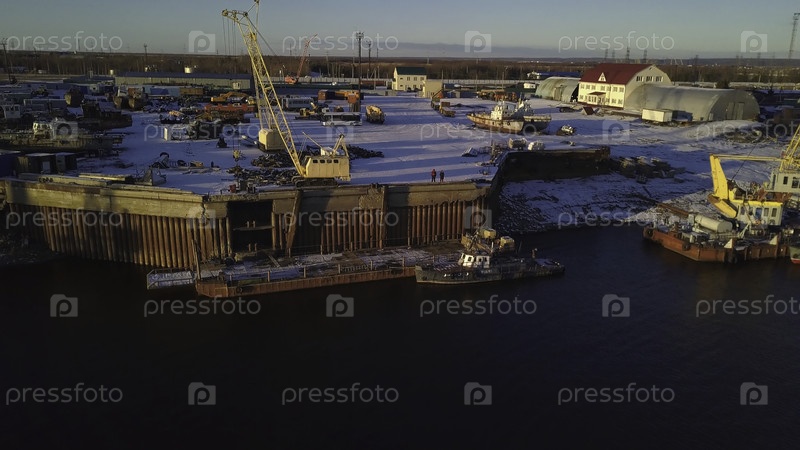 Вид с вертолета. Клип. Парковка грузовых судов в реке зимой возле завода. Запись высокого качества FullHD