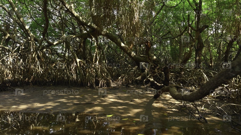 Красивые тропические деревья в болотистой реке. Действие. Лучи солнца проникают через ветвистые джунгли тропической реки. Тропическая болотная область с джунглями и разветвленными корнями