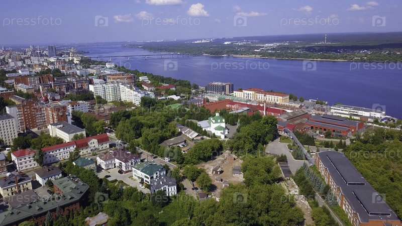 Вид с воздуха летнего города, расположенного вдоль широкой реки. Клип. Зеленые парковые зоны и улицы под солнцем