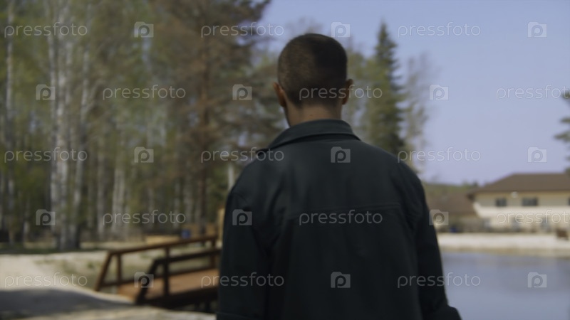 Человек гуляет вдоль озера с местами для отдыха. Скриншоты. Человек ходит по лесу курортного озера в лесу летом. Прекрасное озеро с центром отдыха в солнечный летний день