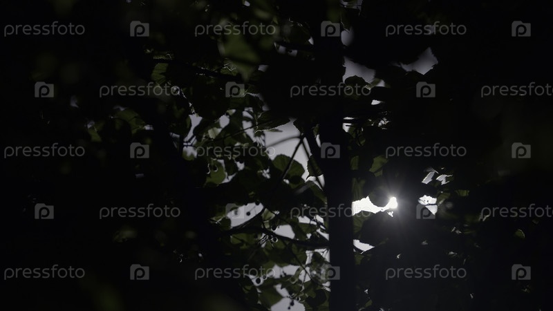 Солнечные лучи проникают сквозь зеленые ветви деревьев. Действие. Волшебный лес с теплыми солнечными лучами, освещающими зеленое дерево
