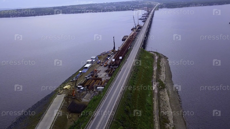 Вид с воздуха длинного моста, пересекающего широкую реку