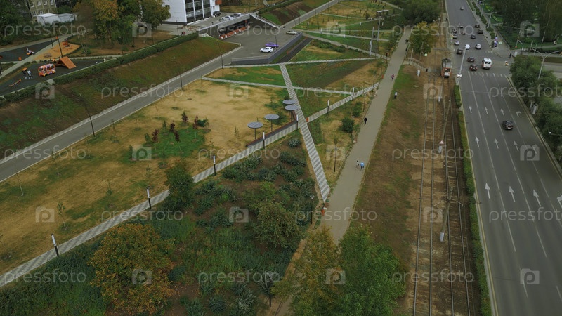 Вид сверху людей, идущих по парковой аллее в городе. Клип. Люди гуляют и отдыхают в современном городском парке. Пейзаж улицы городского парка со солнечными батареями