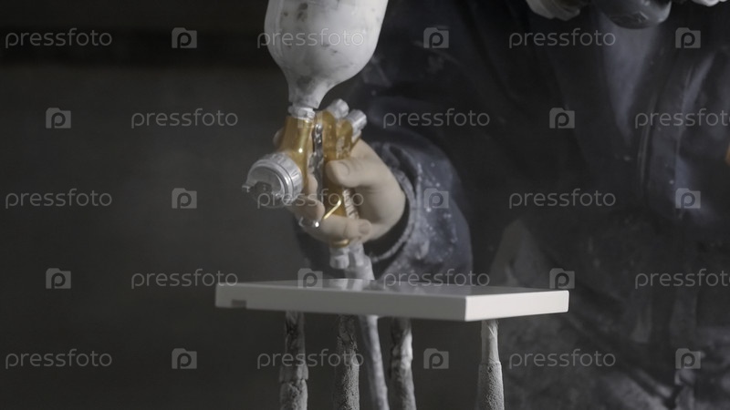 Человек рисует части стола.Креативность.Распыление серой краской с помощью специального инструмента для целей ремонта.Высококачественная запись 4k