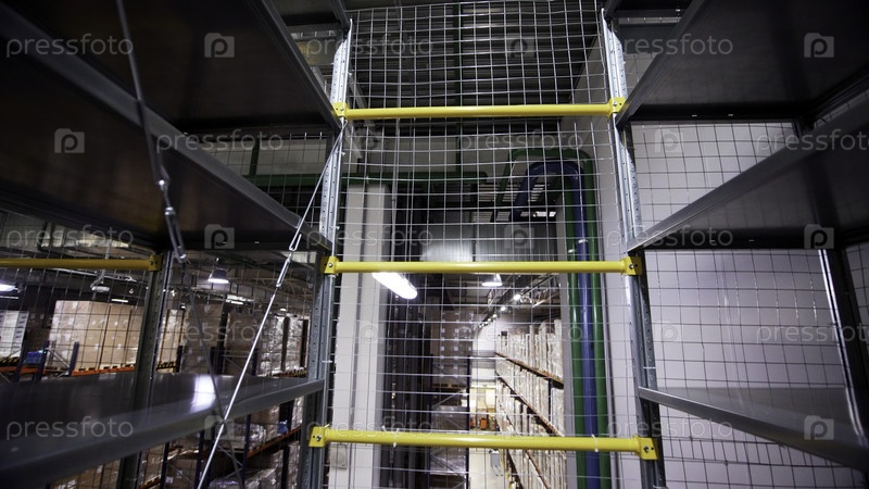 Вид изнутри большого промышленного объекта.Креативно.Следы и полки в хранилище
