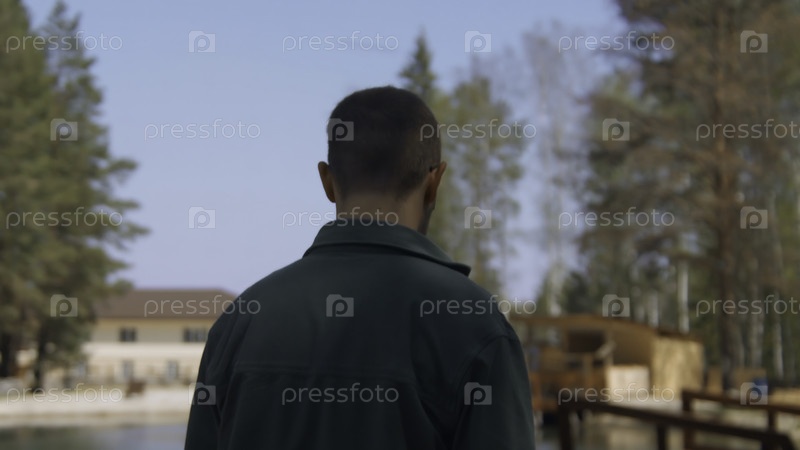 Человек гуляет вдоль курорта в лесу. Скриншоты. Место для отдыха на природе в лесу в солнечный летний день. Мужчина прогуливается по центру отдыха в лесе с озером