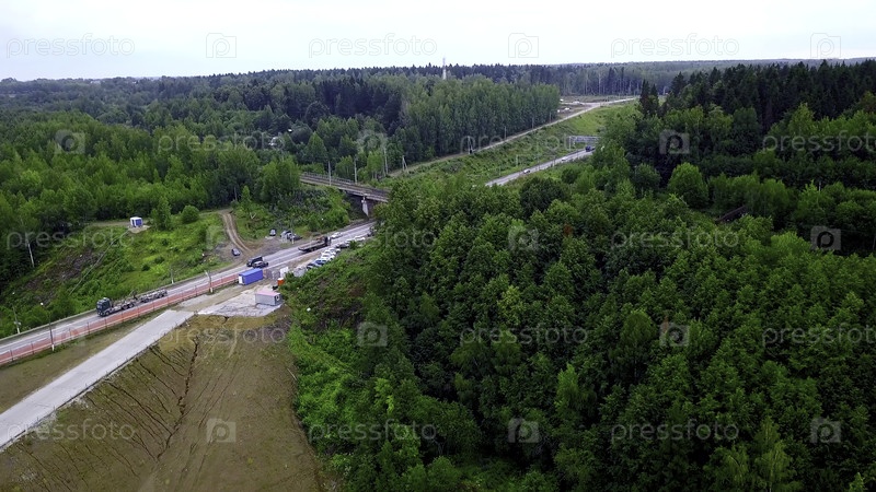 Вид с воздуха автомобилей, движущихся по красивой лесистой местности. Клип. Транспортные средства едут по асфальтированной дороге с прекрасным пейзажем