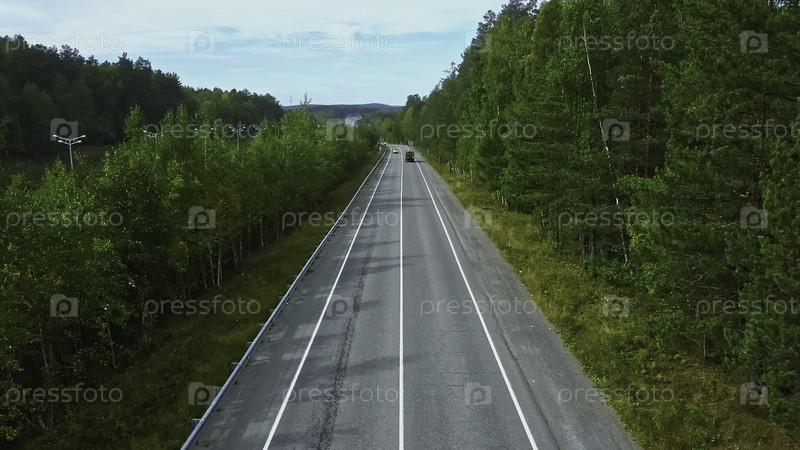 Летающий над скандинавским сосновым лесом, пересекающий сельскую дорогу. кадры. воздушный вид пустой дороги и летнего леса