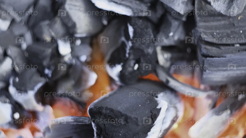 Близкий план сжигания угля для гриля. Концепция. Сжигание черного угля для приготовления пищи на гриле. Угли горят и дымятся. Сезон барбекю и грилла