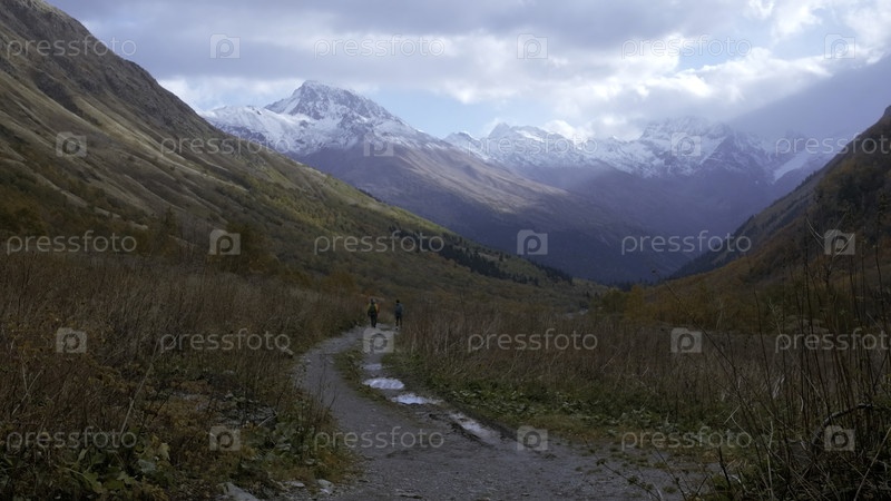 Пешеходы, идущие по тропинке рядом с осенними пейзажами.Креативные.Исследование гор, ходьба к снежной скале