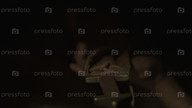 Близкий план человека, берущего большой острый меч СМИ броня для рыцарей средневековых времен