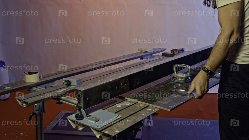 Производство и обработка гранитных плит.Креативность.Работник, использующий вакуумные всасывающие чаши для переноски плитки ларе