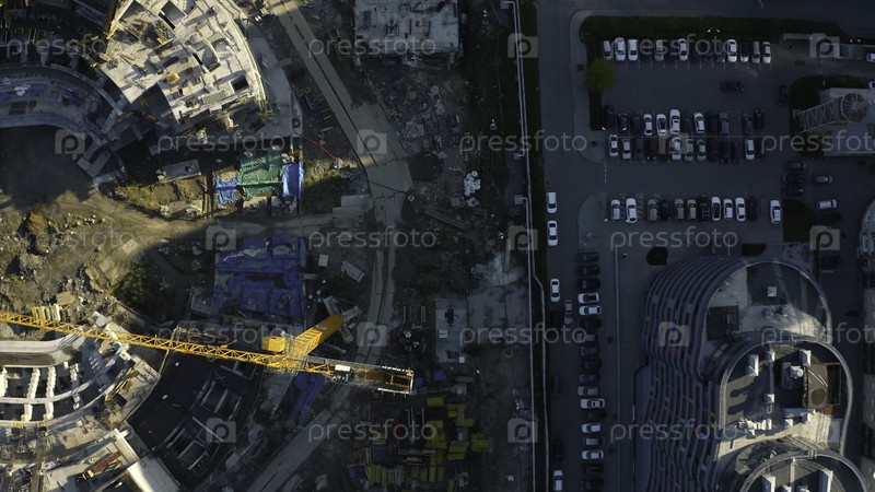 Вертикальный взгляд сверху на строительство круглого здания. Снимок акций. Строительная площадка здания недалеко от парковки в центре города. Строительство стадиона в центре жилого города в солнечный летний день