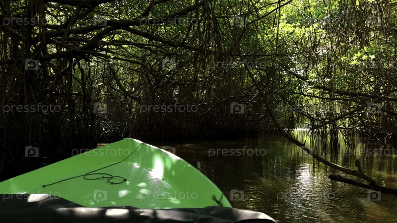 Экскурсия на лодке по тропической реке среди запутанных ветвей деревьев. Действие. Красивая пешеходная поездка вдоль реки в тропическом джунглях