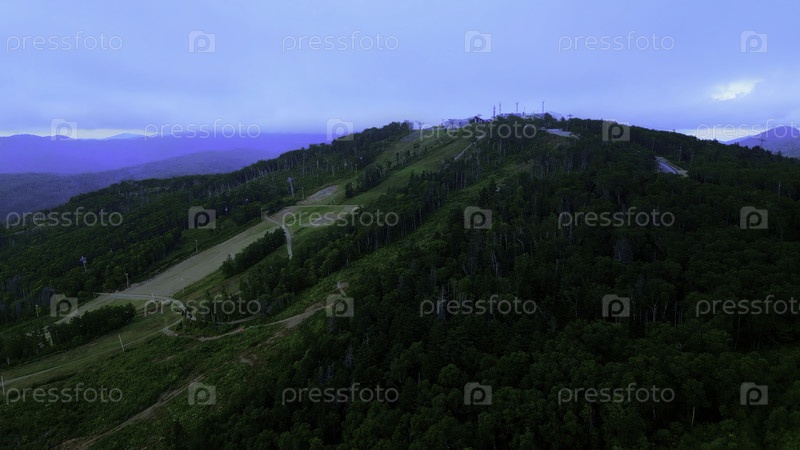 Вид с воздуха канатных дорог в горах. Клип. Путешествия и активные занятия на открытом воздухе, холмы, хвойные деревья и синее небо