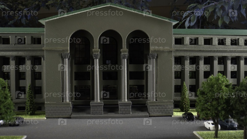 Модель проезжающего трамвая, модель городской улицы. Фотоаппаратные кадры. Миниатюра городской улицы с зданием