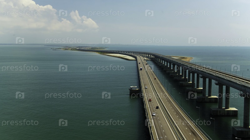 Вид с воздуха моста и реки или моря.Снимок.Долгий узкий мост через города на фоне голубого облачного неба