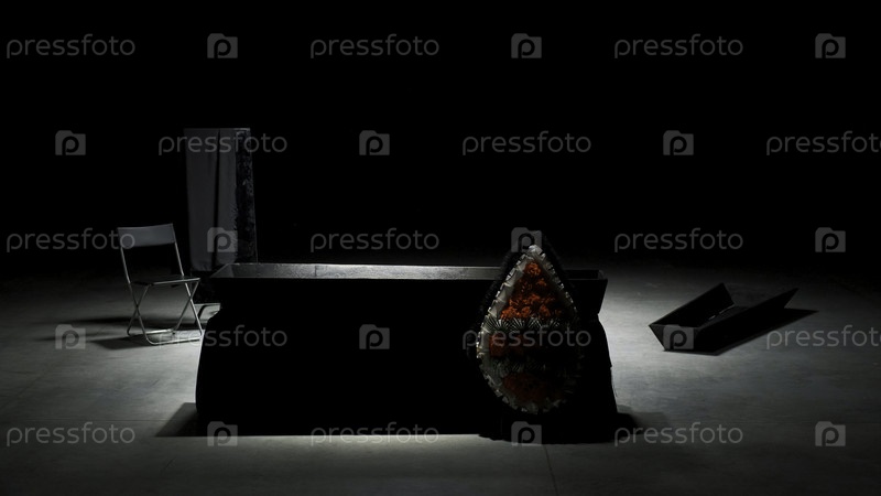 Гроб на сцене. запасные кадры. темная сцена с пустым гробом и похоронными вещами. пустой гроб на сцене в эмоциональной современной театральной постановке
