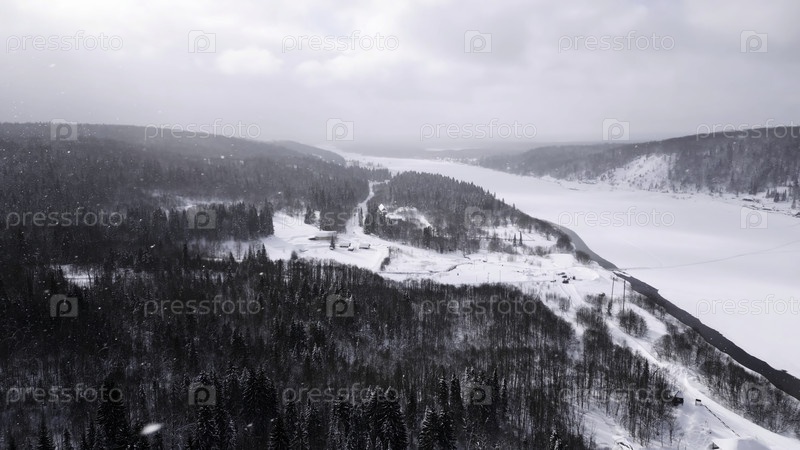 Зимние курортные холмы, покрытые снегом в зимний день. Клип. Горный лес и лыжные трассы и замерзшая белая река