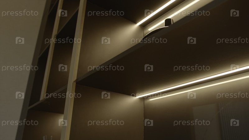Светящиеся полки шкафов. Скриншоты. Современный дизайн интерьера со светящимися линиями света. Светящие лампы на полках кабинета
