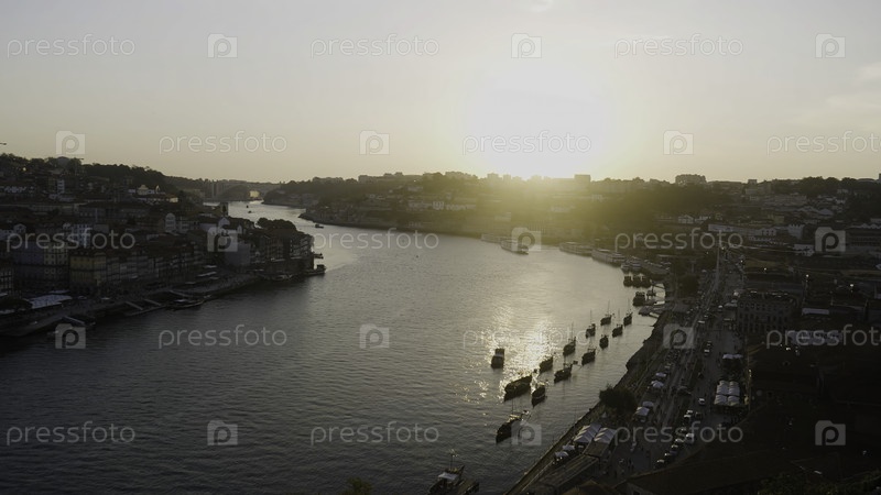 Аэрофотосъемка красивого города и изгибающейся широкой реки.Действие.Авиационный вид заката над южным городом и кораблей на поверхности воды