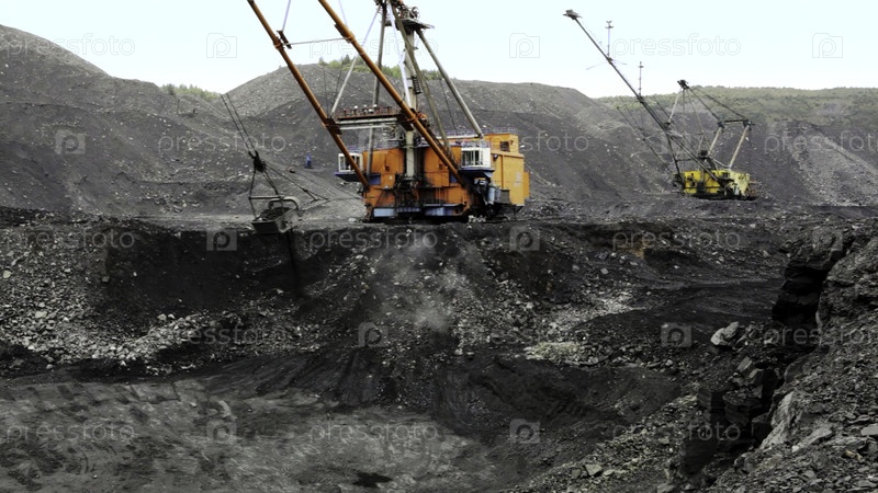 Раскопки и тяжелая техника используются на месте добычи угля, что подчеркивает продолжающиеся промышленные операции