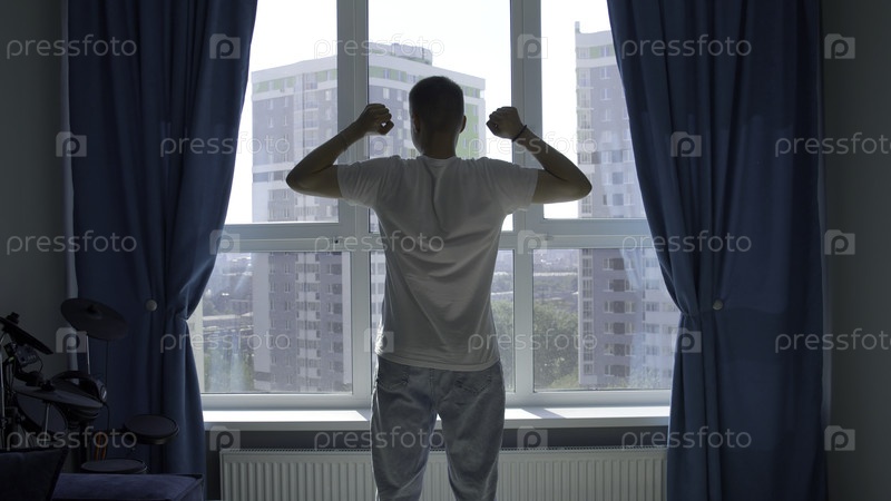 Силуэт мужчины, смотрящего через окно и простирающего руки за голову.СМИ.Мужчина у окна с голубыми шторами