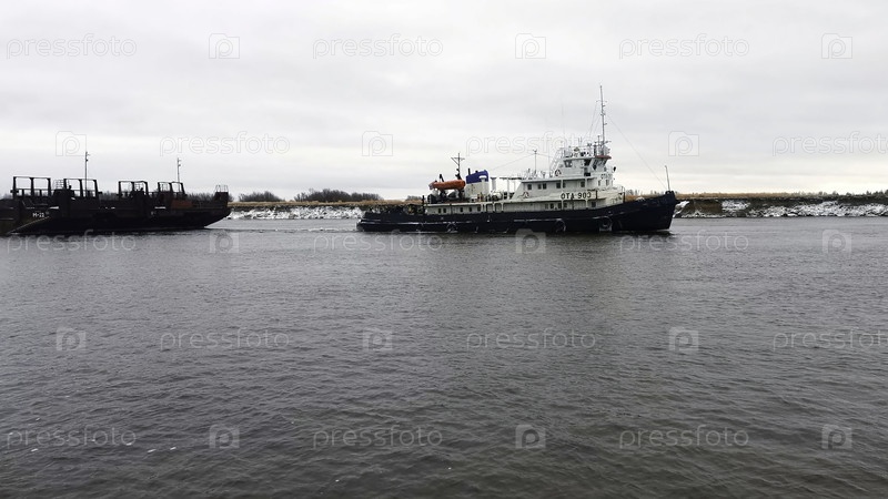 Морские перевозки с баржами. Клип. Плавучие баржи для транспортировки грузов по реке зимой. Баржи на реке в пасмурный зимний день