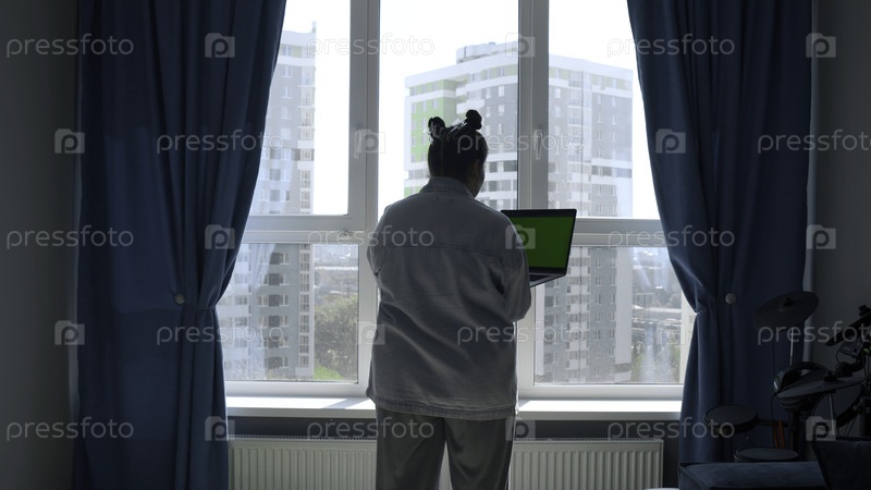 Сзади женщина в пижаме с ноутбуком с хроматическим ключом.СМИ.Женщина, работающая дома, стоящая у окна