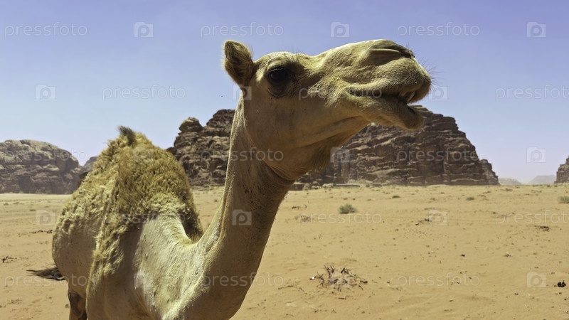 Верблюд величественно стоит в обширной пустыне, окруженный потрясающими скальными образованиями и ясным голубым небом