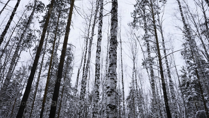 Снежные зимние склоны и лес березовых деревьев.СМИ. Прекрасный зимний пейзаж, спокойный день в лесу