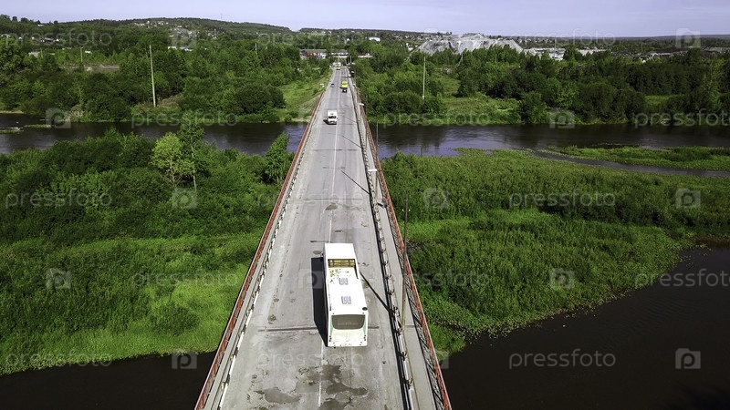 Вид сверху вниз небольшого дорожного моста через реку в сельской местности. Клип. Автомобили, едущие по мосту и зеленая растительность
