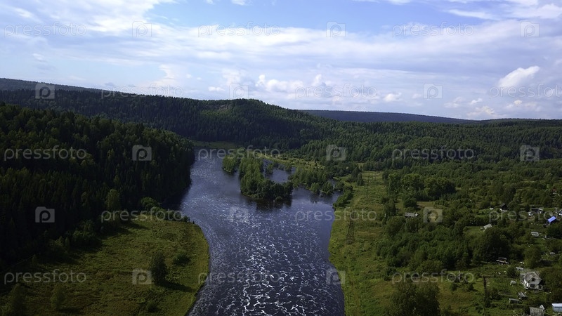Вид с воздуха на реку и лес в летний день, небо и облака. Клип. Летающий над волнистыми берегами рек и зелеными лесами, красивое место с природным ландшафтом