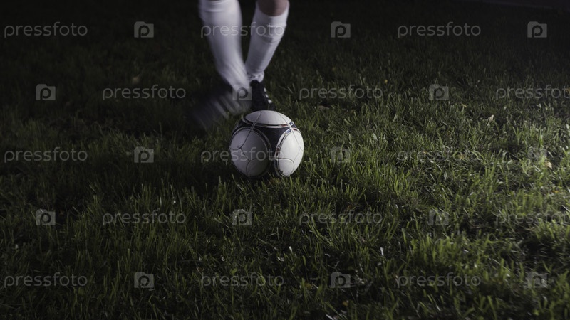 Ближайший план футболиста, бьющего мяч на траве. Фрагмент кадров. Футбольный игрок тренируется ночью на стадионе. Футболист бьет мяч в чемпионате ночью