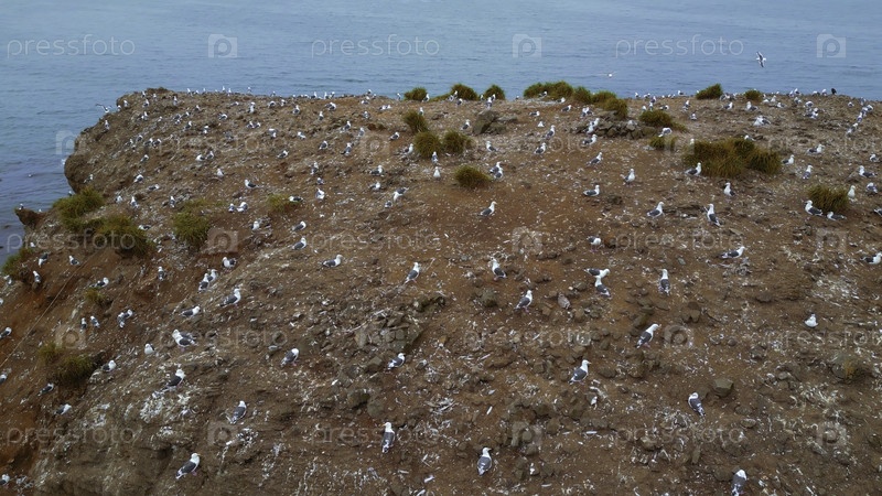 Много чайков на морской скале. клип. верхний вид кинематографической съемки дикой природы побережья. зоология с чайками на берегу