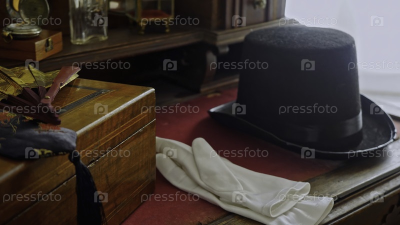 Близкий снимок винтажного стола с коробкой для ювелирных изделий, шляпой и белыми перчатками