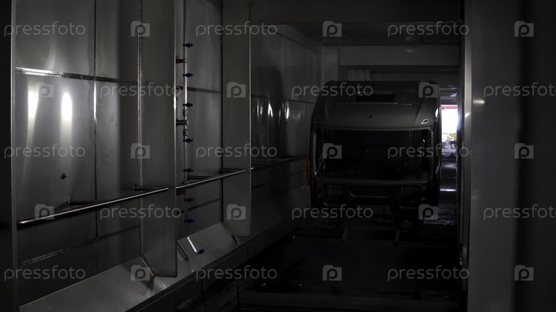 Интерьер большого современного завода по производству грузовых автомобилей. Сцена. Части кузова грузовика внутри мастерской