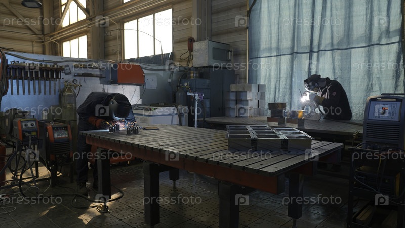 Профессиональные сварщики работают в помещении со замедленным движением.Креативность.Детали промышленного завода