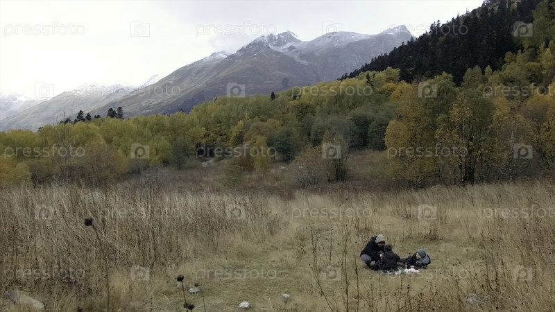 Семейные туристы на пикнике с желтыми деревьями и гигантскими горами на заднем плане.Креативно.Осенний пейзаж в дикой природе