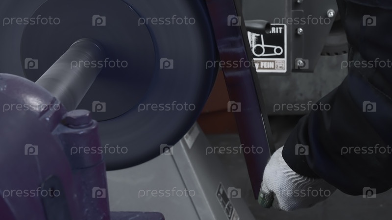 Работник полирует металлическую часть на круговой машине.Креативно.Круговая машина для полирования металлочастей и балки.Рабочий полирует стальную часть на фабрике