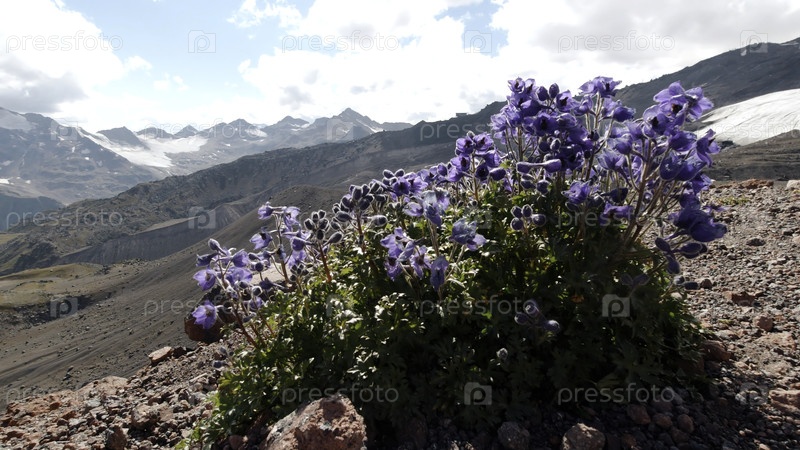 Летний пейзаж Камчатки, вид луговых цветов, растущих на вулканическом шлаке на фоне вулканического массива. Клип. Близок к фиолетовым цветам, качающимся в сильном ветре
