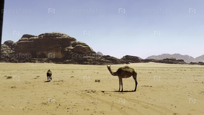 Спокойный и спокойный пейзаж пустыни с красивыми верблюдами в потрясающем регионе Вади-Рум
