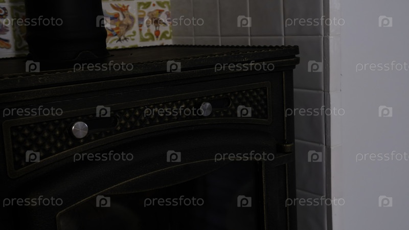 Близкий снимок печи нагреватель дров внутри квартиры с белыми небольшими плитками с животными и цветами позади. креативное. старомодная домашняя духовка