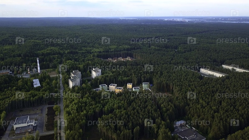 Вид с воздуха на промышленные здания в пригороде города, рядом с лесом и природой